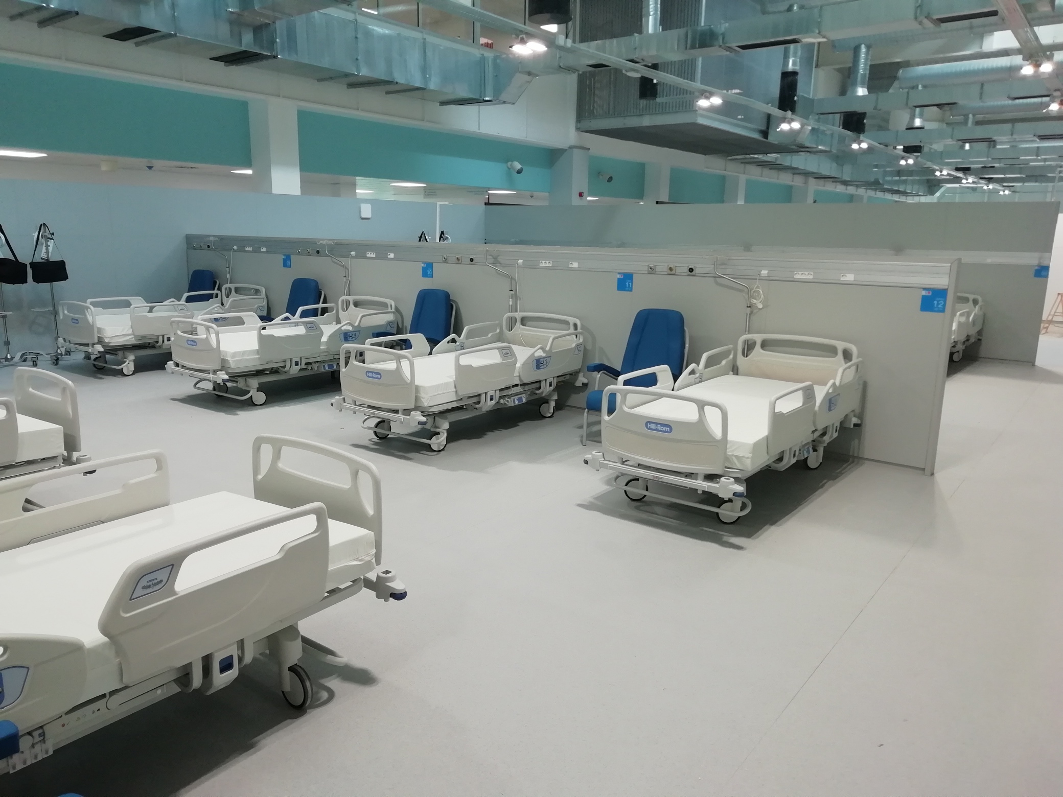 En total, el hospital cuenta con más de 1.000 camas, organizadas modularmente en torno a controles de enfermería de 48 camas. El pabellón central dispone de un área de admisión y triaje, así como un total de 48 puestos UCI y Cuidados Intermedios.